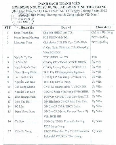 Ngày 02.7.2012, ông Yu Suo – Tổng giám đốc công ty TNHH Phát triển KCN Long Giang vinh dự trở thành Ủy viên Hội đồng Người sử dụng lao động tỉnh Tiền Giang theo Quyết định số 1399/PTM-VPGC ngày 02/7/2012 của Chủ tịch Phòng Thương mại và Công nghiệp Việt Nam (VCCI).
